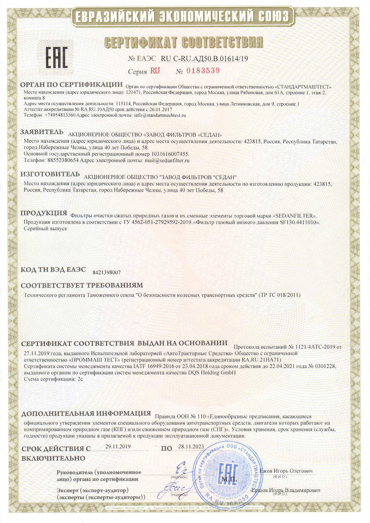 Сертификат дистрибьютора Седан НТЦ об элементах фильтрующих  АЗК о применении газового фильтра в гарантийный период  фильтр высокого давления SF131  фильтр низкого давления SF130